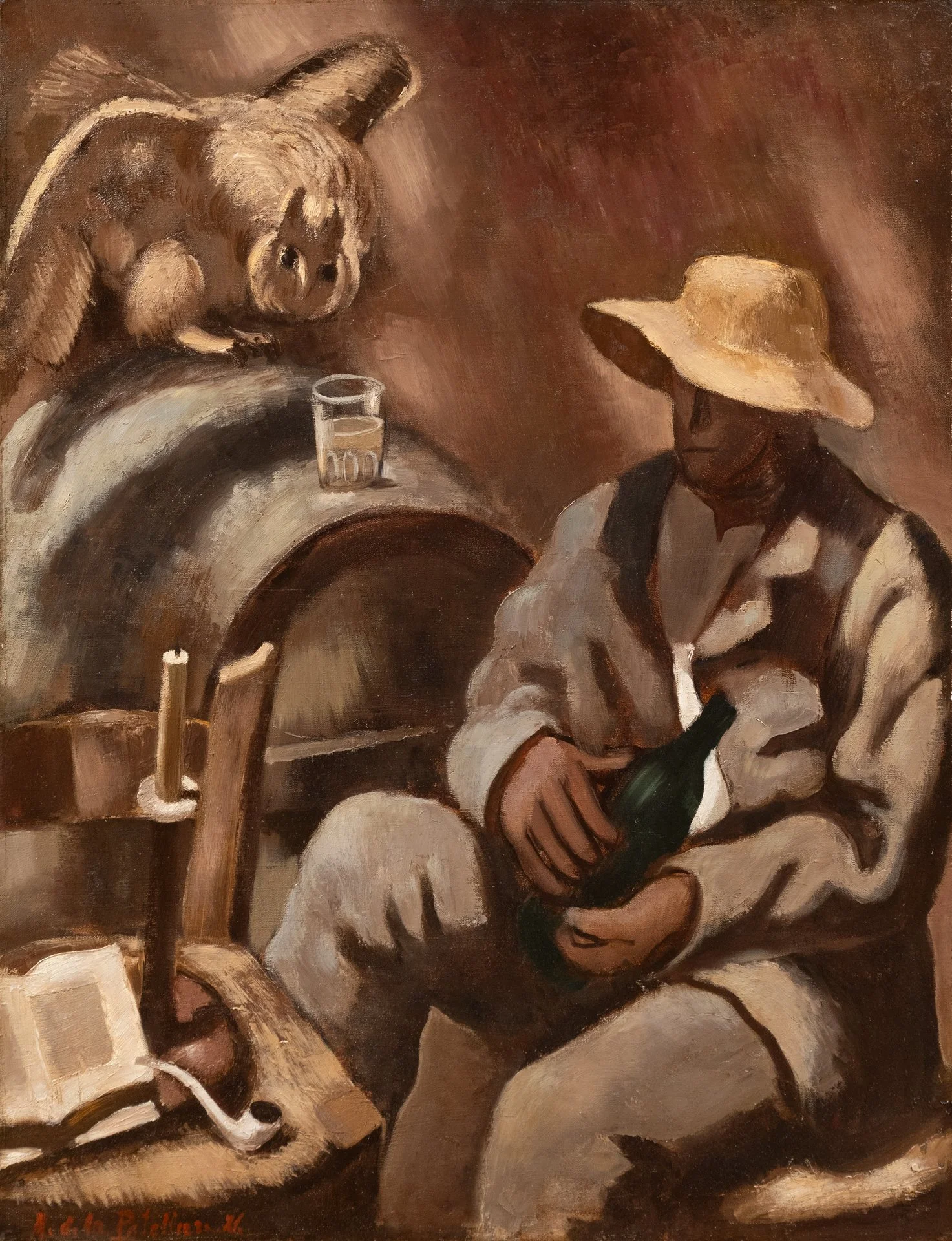 Durant cette courte période, il s’impose comme l’un des peintres majeurs de sa génération, au côté d’André Dunoyer de Segonzac, Yves Alix, Henri de Waroquier ou André Favory. Ces artistes sont marqués par le réalisme qui est alors la tendance prédominante dans l’art français. Ils refusent l’académisme et ont intégré le souci d’ordre et de construction du cubisme. Ils ne forment pas un groupe homogène et tous s’affirment comme des indépendants. Dans cette floraison d’individualités, La Patellière occupe une place singulière. Homme d’une profonde spiritualité, son esthétique est faite de « la coexistence d’éléments contraires – mais non contradictoire » où se mêle ainsi soucis de construction et lyrisme, onirisme et ancrage dans le réel, attachement à la figure de Delacroix et attention portée à Picasso et à Matisse… L’apport de la littérature est prépondérant dans la compréhension de son œuvre. Grand lecteur, sa peinture y trouve ses fondements théoriques. S’il partage avec Maurice Denis un fort intérêt pour les écrits de saint-Thomas d’Aquin, il se nourrit aussi de la mystique de l’allemand Jakob Böhme, qui sera l’une des principales sources de son « surréalisme », ou dans celle de Plotin. L’objectif de La Patellière est de «transposer la nature par des moyens plastiques pour la situer dans un plan spirituel.» Notre tableau intitulé Philosophe à la bouteille, réalisé en 1926, est une synthèse des réflexions de l’artiste. À la manière d’une vanité, l’homme silencieux contemple le temps qui passe entre sagesse, nostalgie et plaisirs terrestres.