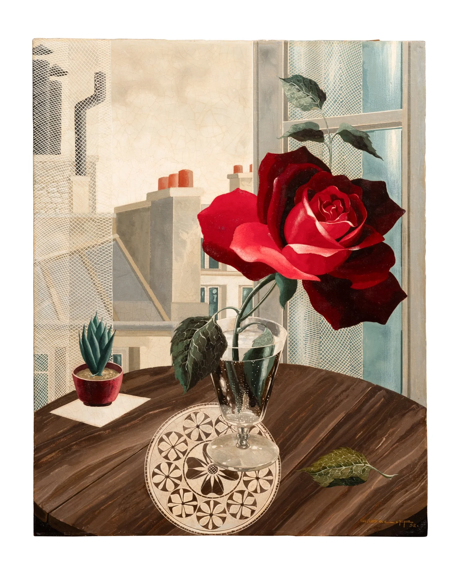 Sa carrière prend un tournant en 1946 avec une première exposition à la Galerie Vendôme, puis un véritable succès en 1952 chez Dina Vierny, où toutes ses toiles sont vendues. Racoff se consacre alors pleinement à la peinture, travaillant avec une minutie extrême. Proche de Jules Lefranc, il représente des rues et quais de Paris, souvent déserts, baignés d’une atmosphère poétique et mystérieuse, ainsi que des natures mortes et trompe-l’œil d’une grande délicatesse. Son univers singulier, mêlant naïveté, rigueur et étrangeté, est à la fois bouleversant de sincérité et merveilleusement inventif.