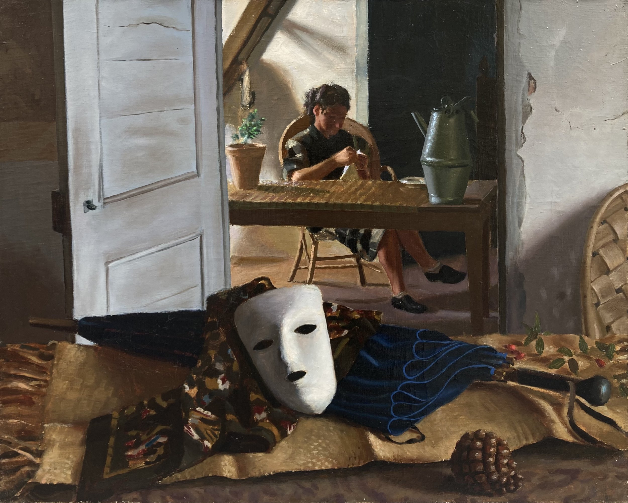 A partir des années 1920, nombre d’artistes, dont Manessier, Henschel, Wacker, Lhote ou Braque séjournent à Marminiac dans le Lot. Une véritable synergie s’opère dans ce lieu bucolique où la peinture est le catalyseur de ces jeunes peintres. Jean Léon y réalise notre tableau La Couture. Dans l’intérieur rustique de sa maison, une jeune femme coud. Au premier plan, une composition énigmatique, où le masque semble nous interroger.